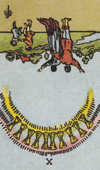 그리고 마지막 단계인 10번 카드에서야 비로소 컵은 사랑을 전적으로 신뢰할 수 있게 된다. 이제 나눌 가치가 있는 무언가를 가지고 있기 때문이다.