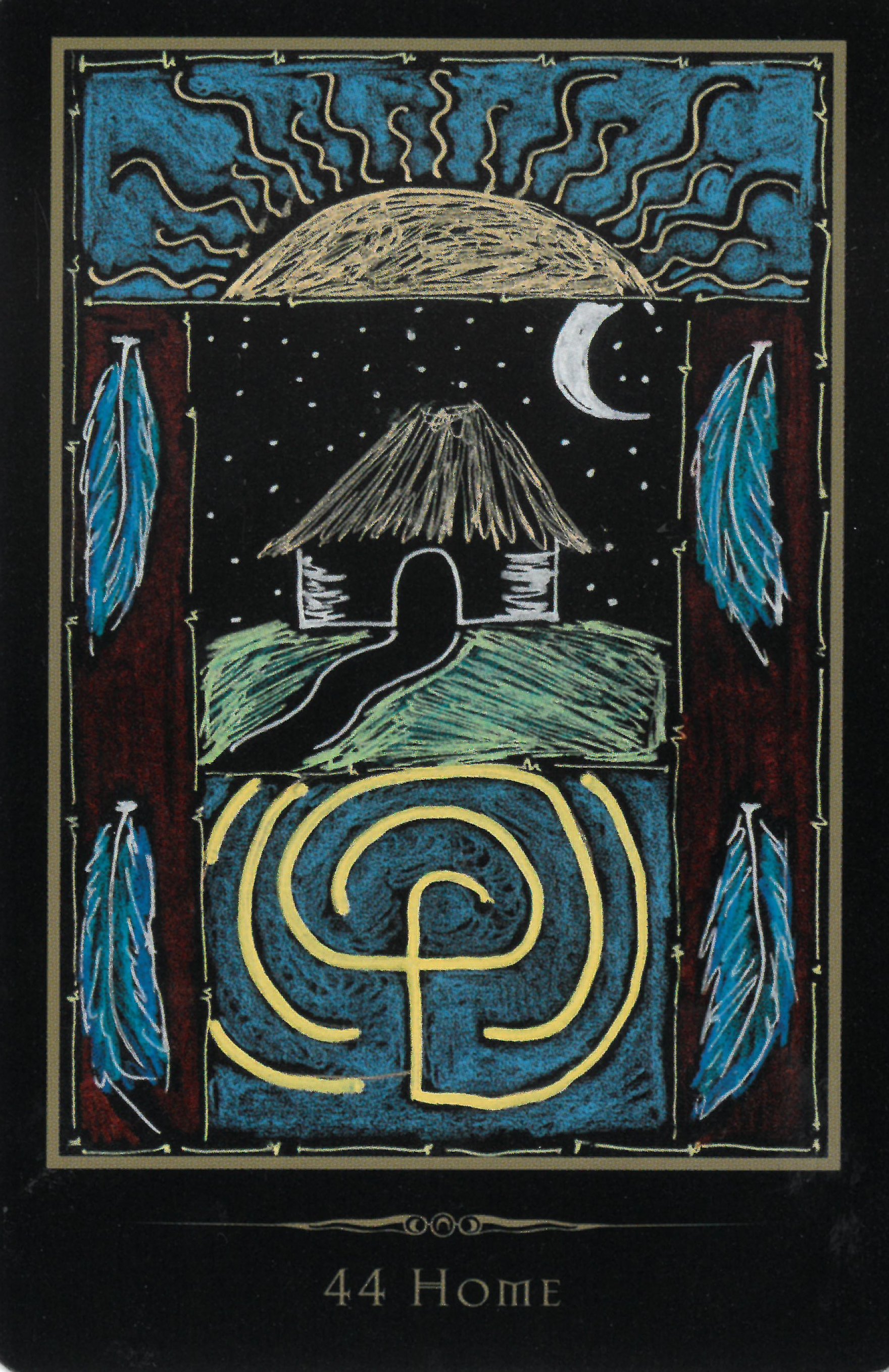 44. Home This card represents a homecoming of the soul, of finding your tribe, of coming home. The situation you are inquiring about has the potential to be a homecoming—a safe and secure place that both nourishes you and facilitates your growth, whether it be a school, a relationship, a job, or truly a home. Go for it! All paths lead home. Home doesn't have to be where you grew up; family doesn..